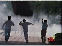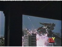 Continued, Q-Rex continues to head left while spark bursting buildings as he passes them. |
