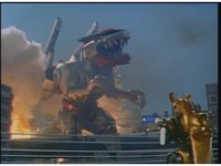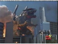 Commandocon talks to Q-Rex, gesturing as he does, then raises his spear, and fires off a control device onto Q-Rex's head. The Zord roars, and crackles with electricity, as Commandocon works the control stick on his spear. |