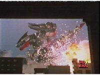 Explosions erupt in the city around Q-Rex, spark bursting him as he's surrounded by smoke and dust. |