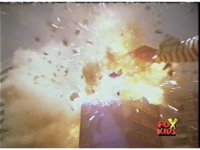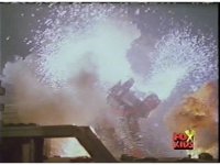 More explosions erupt against, on, and around Q-Rex, who writhes in agony from them. |