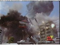 Japanese citizens flee across the screen as Q-Rex smashes buildings to explosive bits. |