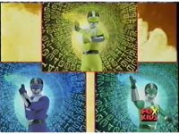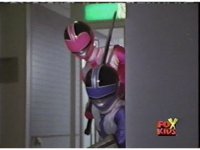 Blue notices a crack in the dimension, and points it out, Pink nod-talks, then Red, as all five Rangers race for it, the Evil Rangers following behind. |
