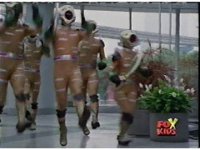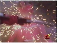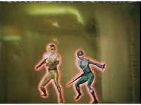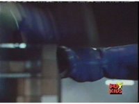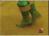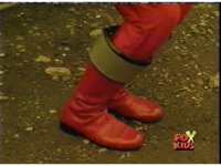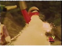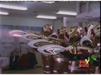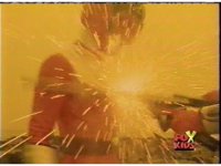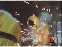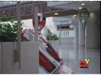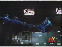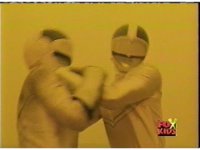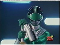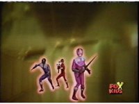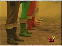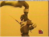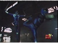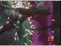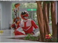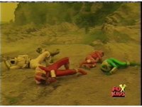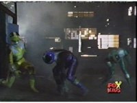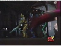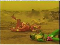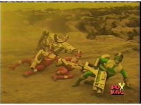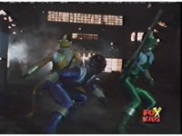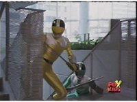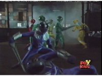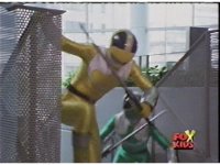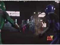 In a warehouse dimension, the Evil Rangers fight the three Rangers, Evil Red & Yellow slash Yellow sparkily until she falls, Evil Pink & Green slash Green sparkily until he falls. |