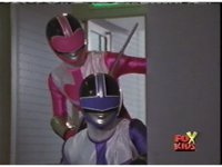 The Rangers fall down, the Evil Rangers turn around, Pink nod-talks, then they get up and pull out their V-Weapons, only to have their Evil doubles do the same. |