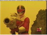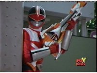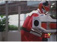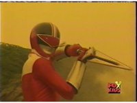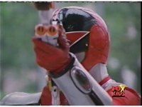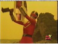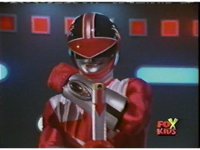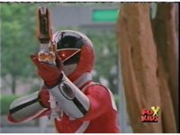 Red pulls out his control saber, flips it around as it transforms into a double for the Saber blaster thingy. |