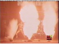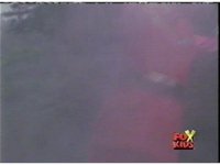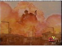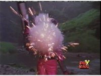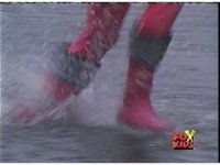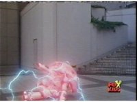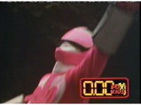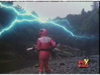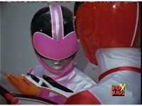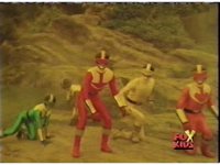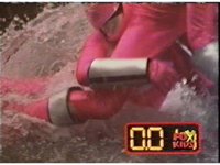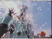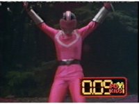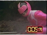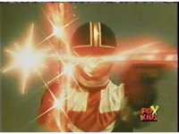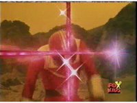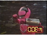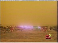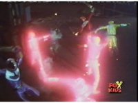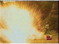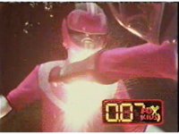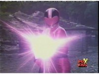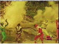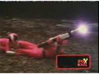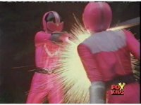 Red fires the Electro Booster, just as Pink fires V5, the simulation showing the act, as the spot above Pink explodes, and the other three Rangers are teleported out just as they're beating the other Evils. |