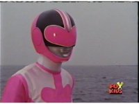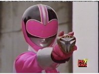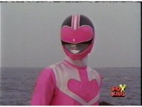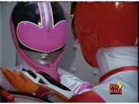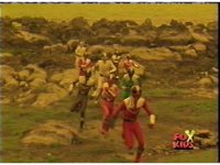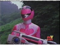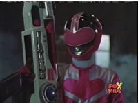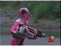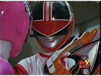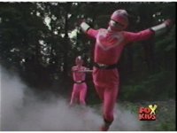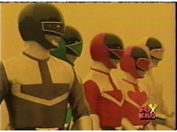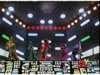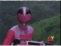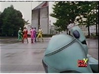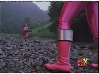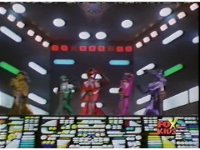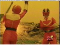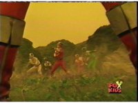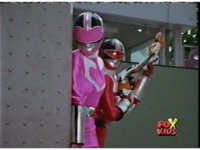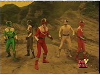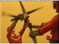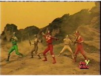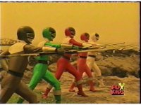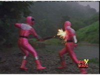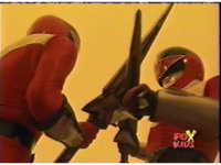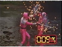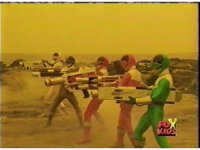 The three Rangers regroup, the Evil Rangers approach with their V-Weapons, Evil Pink suddenly leaves, Yellow and Blue reacting, before they get fired on explosively by the remaining four Evils. |