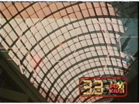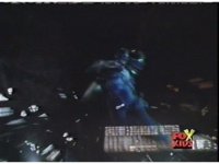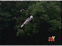The portal opening on top of a stadium dome, the five Time Flyers shoot out of the vortex and into the present. |