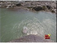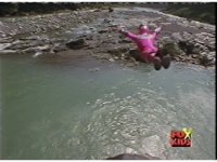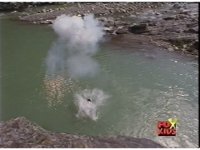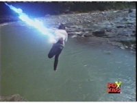 Eric falls into the river, getting blasted sparkily on the way down. |