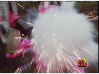 Conwing bursts with pink smoke and sparks. |