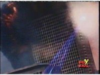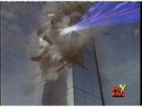 As beam hits it, mirrored-windowed skyscraper erupts outward from within, spraying debris onto the many surrounding buildings. |