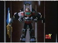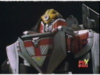 Along a mountainous terrain, the five Time Flyers shift around and transform into the Time Force Megazord Mode Red. |