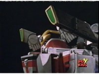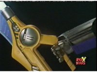 The five V-Weapons connect into the Vortex Blaster, which the Rangers brace around in a hyperspace tunnel as it charges up. |