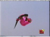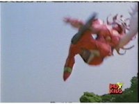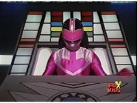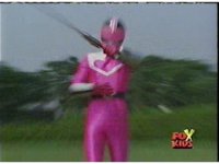 Contemptra gestures hand to face then fires an energy whirlwind, blasting down the four Rangers, when Pink suddenly jumpkicks into her. |