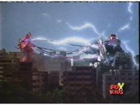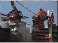 Time Shadow & Mode Red pose battle ready at Contemptra, who then unleashes her tentacles upon them, then sending electricity though them, spark bursting the Megazords. |
