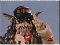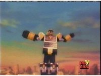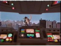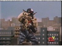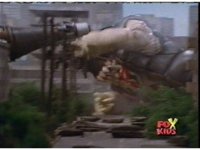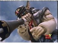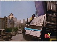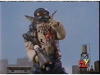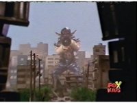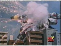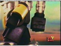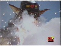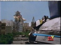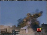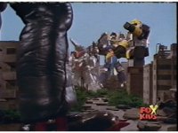 Cuts before he gestures; US replaces follow-up of Cyclobots. Then cuts Cinecon bullhorn blasting Megazord. |