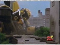 Cinecon bullhorn blasts Trans-Warp Megazord & Q-Rex, knocking them both down. |
