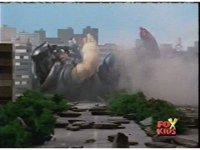 Shadow Force Mode Blue steadies its feet, readies its blaster, Cinecon still approaches, so Red stands with fist raised, then the Megazord fires, sparkily blasting the Mutant down, to which Red makes celebratory gestures. |