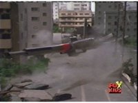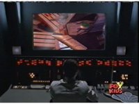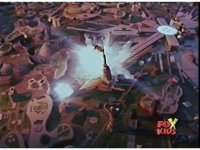 The portal opening on top of a stadium dome, the five Time Flyers shoot out of the vortex and into the present. |
