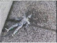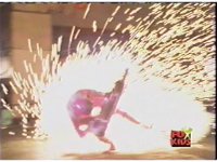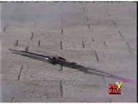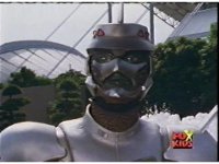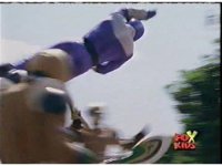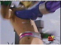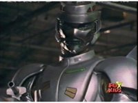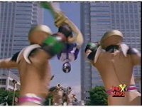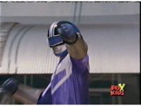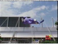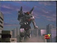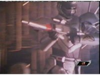 Blue leaps forth, and corkscrew kicks into some Cyclobots, then flips off them and kicks into another pair. |