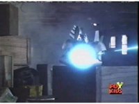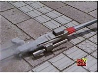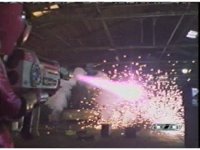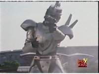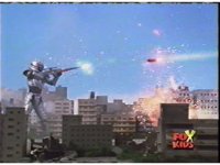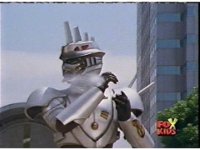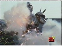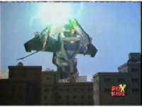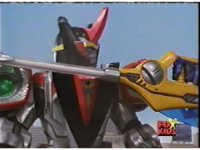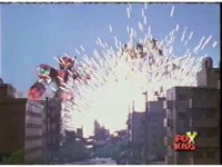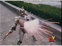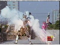 Steelix fires his rifle at the two Megazords, spark bursting around them. |