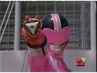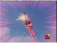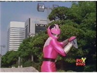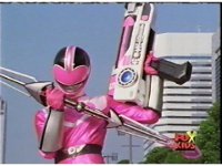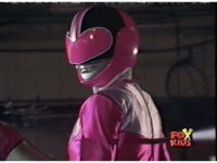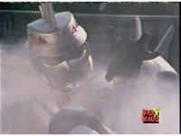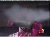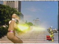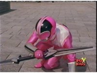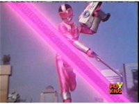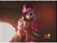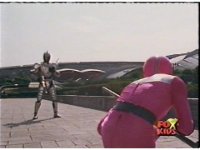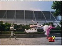 Steelix approaches, talking and motioning his hand, Pink whips her Sabers about, firing pink bolts at the Mutant, who dodges and fires back, sparkily blasting her down. She recovers to a crouch, as he talks at her some more, then fires sparkily upon her, though she vanishes amid the smoke, leaving behind only her Chrono-Sabers. |