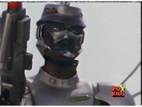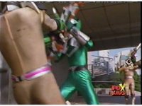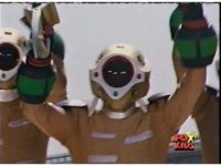 Green blocks a Cyclobot's attack, then kicks off of it and leaps up, firing the Electro Booster down upon several, vaporizing them. |
