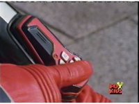 Pressing a button on his Morpher, Quantum then talks into it. |