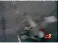 Close on upper roof area of building, as the antenna at the top spark bursts, quickly causing the rooftop structure below it to explode into debris. |