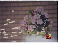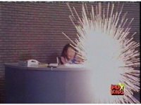 Sparkles burst on a Japanese lady's desk, blowing up her flowers. |
