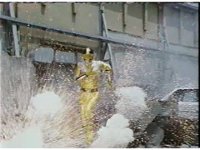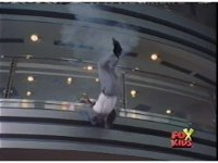 Sparks erupt, then a Japanese businessman plunges over the railing. |