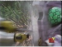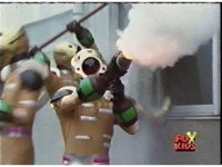 Red readies his Chrono-Saber, then leaps up, and begins to sparkily slash Cyclobots. Green does the same, then Pink. |