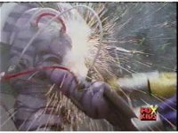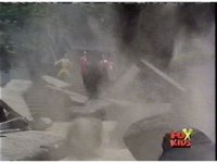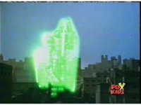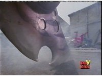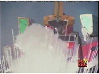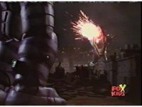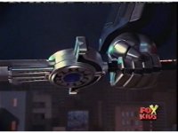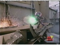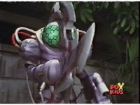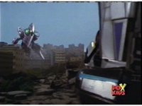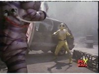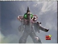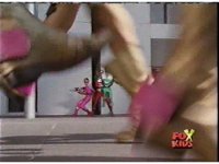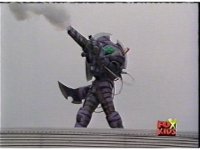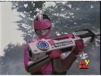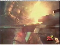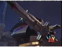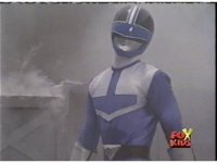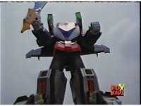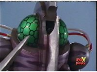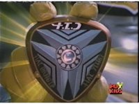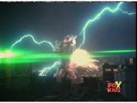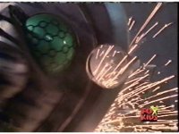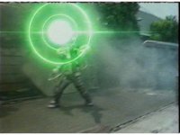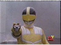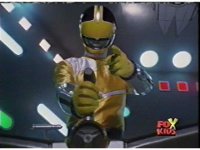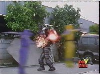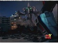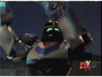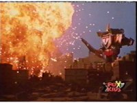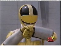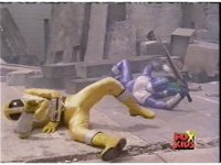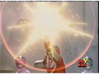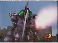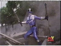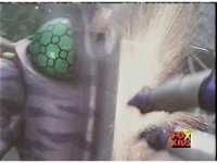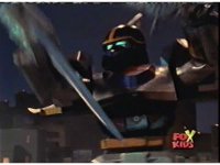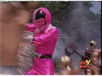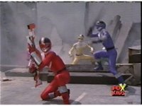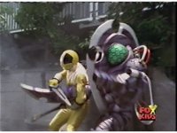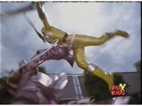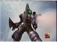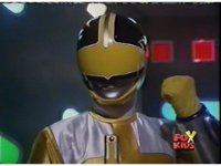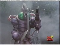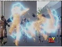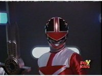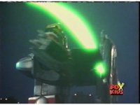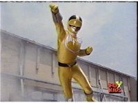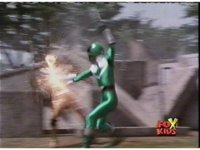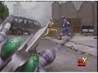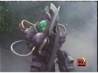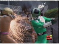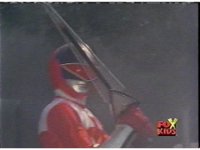 The other three Rangers arrive and regroup around the downed pair, Red then firing the Electro Booster sparkily upon Severax, who then slashes his blade arm down at them, causing the team to roll to safety, before Yellow nod-talks to her Morpher. |