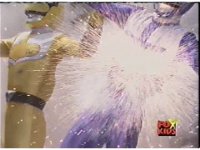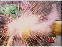 Sparks burst about as Yellow charges forth, then leaps up and does a flying punch sparkily into Severax, who's thrown by the hit. |