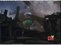 The portal opening on top of a stadium dome, the five Time Flyers shoot out of the vortex and into the present. |