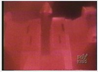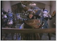 Camera zooms out from Rita's angry, screaming face on balcony as her henchmonsters appear upset by it. |