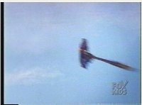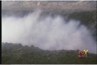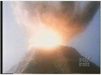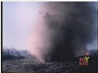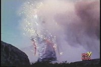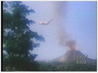 Pterodactyl Dinozord flies out of the smoking volcano and disturbs trees as it reaches them. |