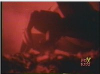 Quick zoom to the back of the stage area where Black and Red Rangers fight Putties. Red pins the arm of an Extra-Chunk Putty and talks. |