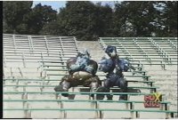 Continued in progress from two shots ago, Black finishes knocking Putty over, when another kicks at him, he ducks, then footsweeps it down. |