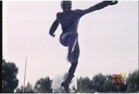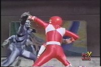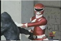 On stage, Red avoids Putty's high kick, then when he tries to punch him, the Ranger grabs his arm and flips him on his back. |