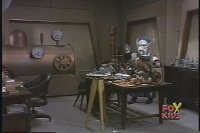 Zoom out from Rita looking out from Repulsascope, smiling and snapping fingers before looking back in it. Squatt & Baboo look at one another, then at Rita, before Baboo steps toward her, talking. |