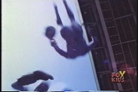 Upward angle as four Putties flip over camera under stage roof's edge. |