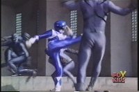 On stage, Blue Ranger high kicks Putty down, then footsweeps one behind him down, before double-punching approaching Putty in chest. |