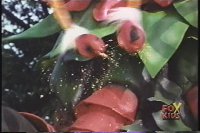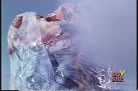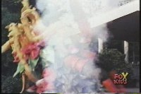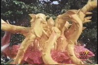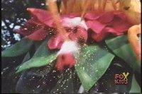 Cellophane-wrapped Pineoctopus gets a gust of dirty wind sprayed at it, causing its golden sparkle dust to blow up at it, until a bright flash heralds the monster blowing away to nothing. |
