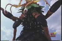 Black Ranger, holding Putty by the top of the head, then flips him over, sharp zoom in on Black pointing outward briefly. |