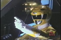 Sabertooth Tiger cockpit, side angle, of Yellow Ranger turning and looking back, before forth and pointing briefly. |
