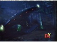 Pan over to the well-lit Prison Ship in the forest at night. |
