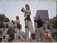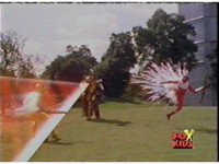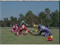 Red flips in and begins to battle Frax, who sparkily strikes each of the Rangers, hitting Yellow a few times especially, then spreads his arm menacingly. |