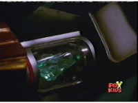 Frax comes down some steps, and enters a room, where he picks up a Trizirium Crystal canister off a stack of several, talks, then sets it down, then goes over and pulls the sheet off of Maxax. Frax then takes the Trizirium Crystal out of the case, and puts it within the E-Z-Bake Oven, operates the controls, and energizes it. |
