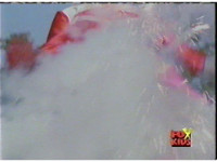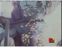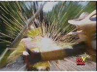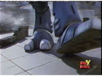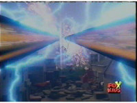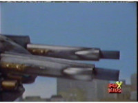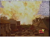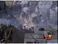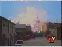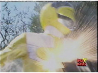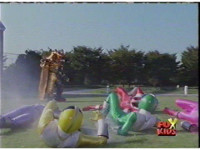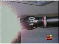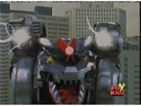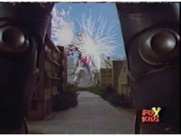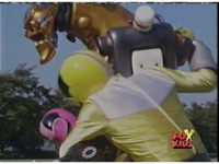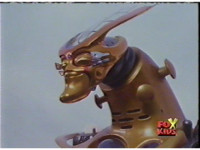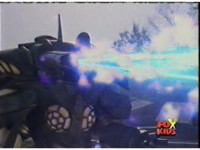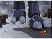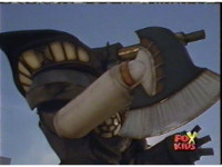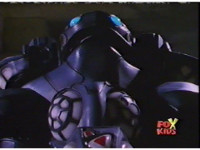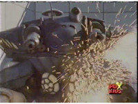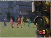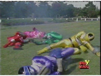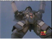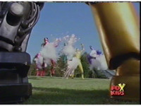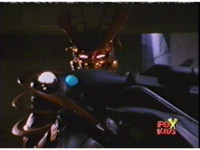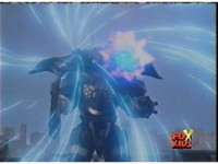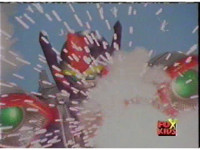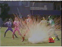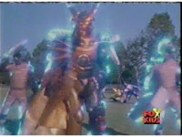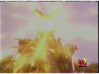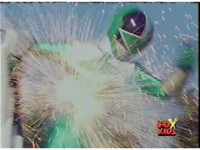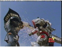Frax walks along, pops open his face, and fires mouthbeams at each Ranger, sparkily taking them down, save for Green, who fires upon him sparkily with V3, but Frax is unharmed, pressing on and firing back, sparkily. |